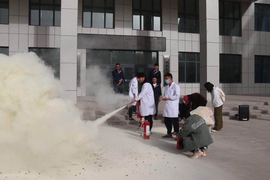 疏散至实验楼外后,由保卫部工作人员向大家介绍了火灾的种类,重点讲解并示范了灭火器的使用方法,现场师生积极参与进行了灭火器现场实际操作。针对大家在使用中存在的问题,保卫部工作人员进行了指导。