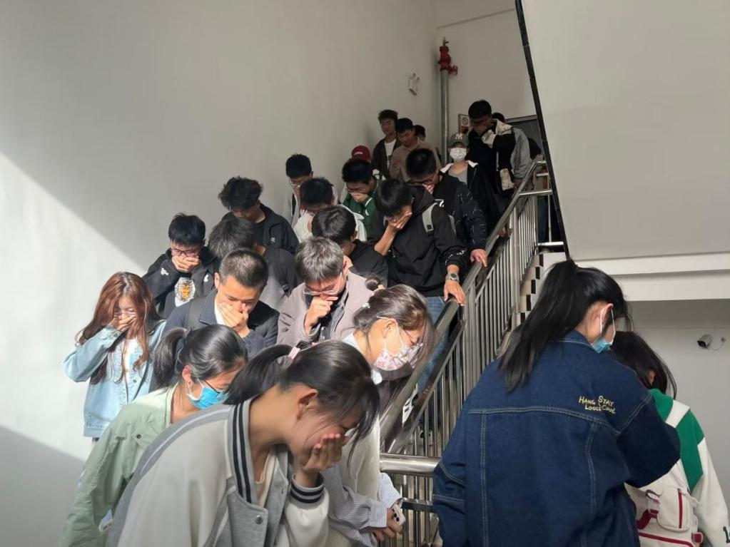 演练模拟医科楼楼内着火,消防控制室值班人员发现火情后,立即进行上报,启动消防应急疏散预案,同时迅速拨打“119”报警。指挥组和疏散组等成员按照分工,有条不紊地疏散楼内师生。