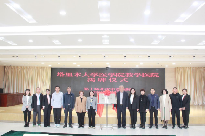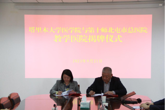 ——第十师北屯市总医院教学医院”签约揭牌仪式。第十师北屯市总医院党委书记、院长聂信胜,院党委领导班子成员及相关科室负责人参加会议。第十师北屯市总医院党委委员、副院长陶丽丽主持会议。