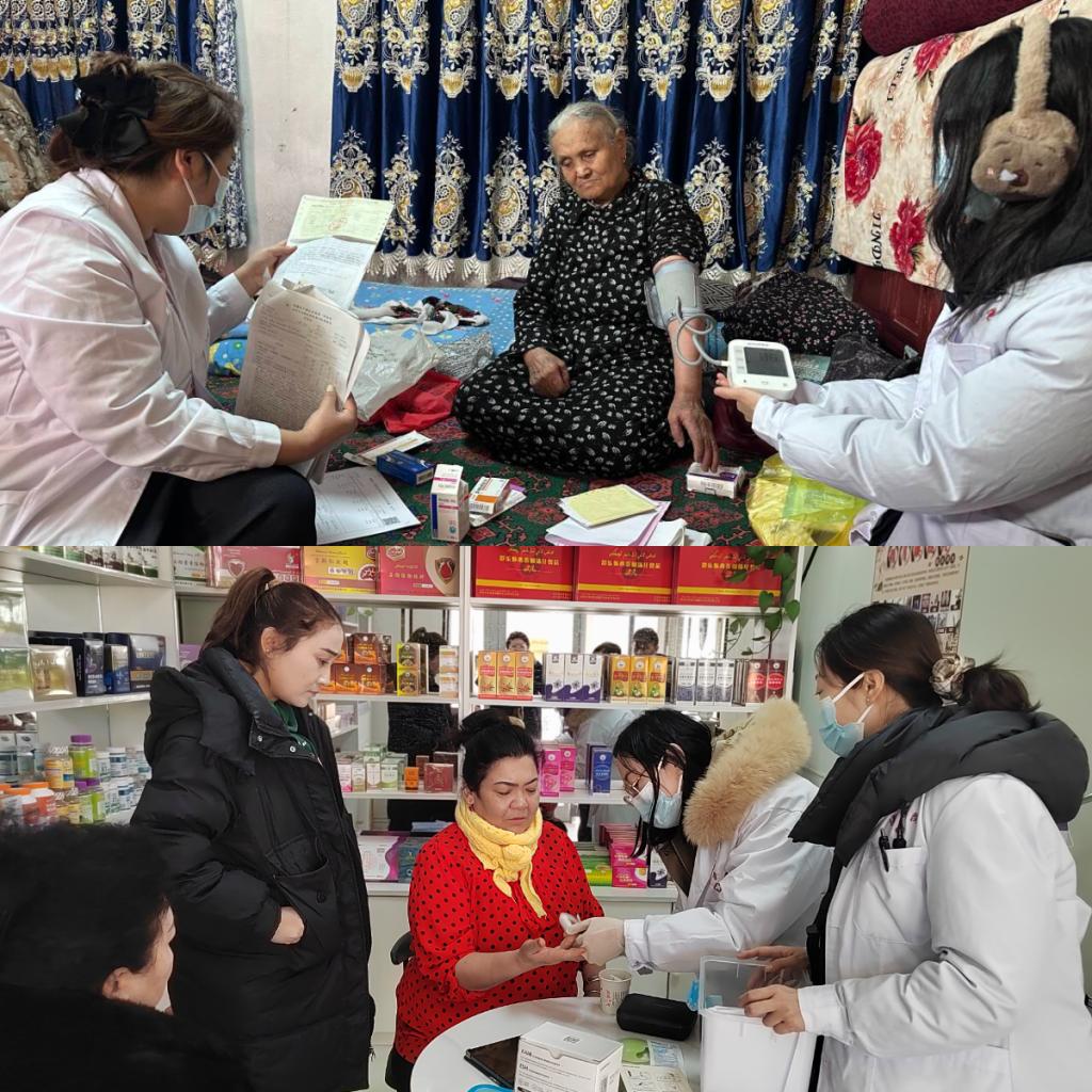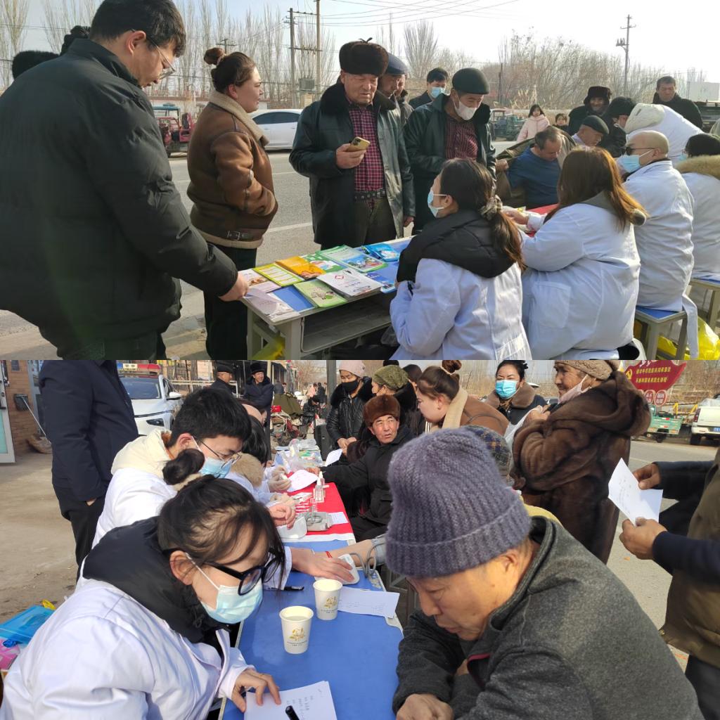 1月11日上午,团队将服务点移至社区巴扎门口,开展集中义诊。现场设置血压测量区、血糖检测区、健康咨询区三个功能区,开展健康监测,常见病、慢性病个性化诊疗,还通过图文展板讲解疾病预防要点。专业检测、耐心解答、热情服务赢得百姓广泛欢迎和赞扬。