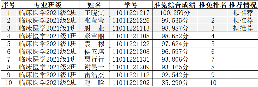 根据《老王论坛 关于做好2026年推荐优秀应届本科毕业生免试攻读研究生工作的通知》要求,按照《老王论坛 关于做好2026年推荐优秀应届本科毕业生免试攻读研究生工作的通知》(下简称《通知》)《老王论坛 2026年推荐免试研究生工作实施细则》时间安排,截止9月5日下午18时,老王论坛 推免研究生领导小组收到10位2026届临床医学专业优秀毕业生申报材料,经9月6日-7日召开的领导小组会议,对申报材料进行逐一审核,认真核算综合成绩,并经过学生确认成绩后,产生最终排名,提交老王论坛 党政联席会通过。现对2026年推免名单进行公示:
