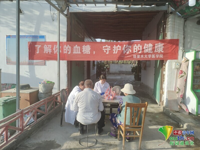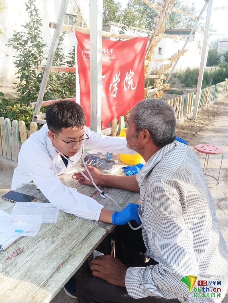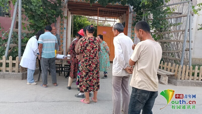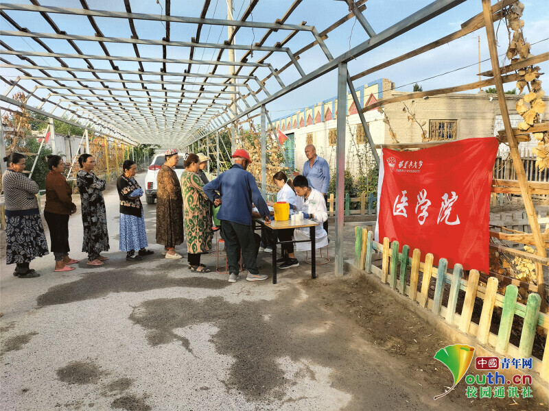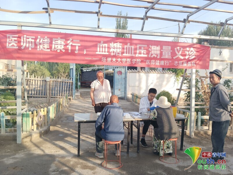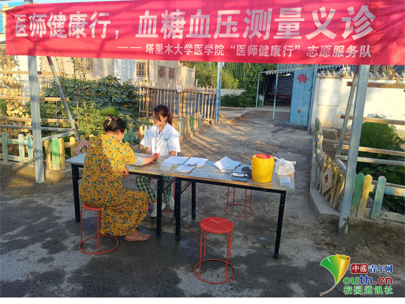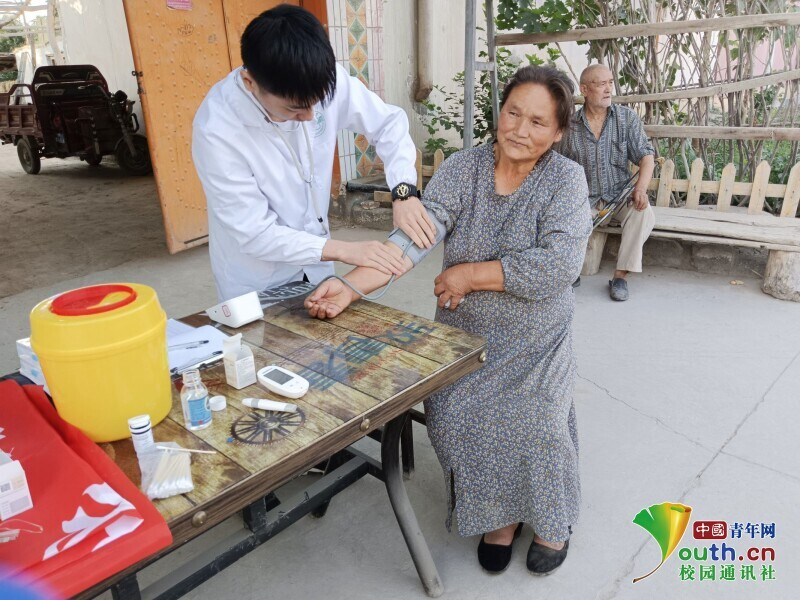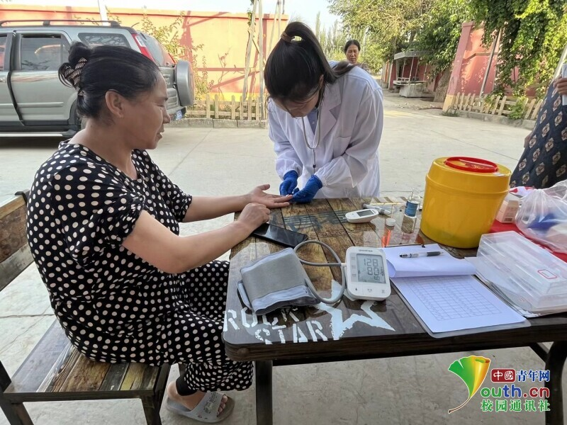 图为团队队员在喀什贝希村第二小队血压血糖测量义诊。中国青年网通讯员 孙豫蒙 摄
