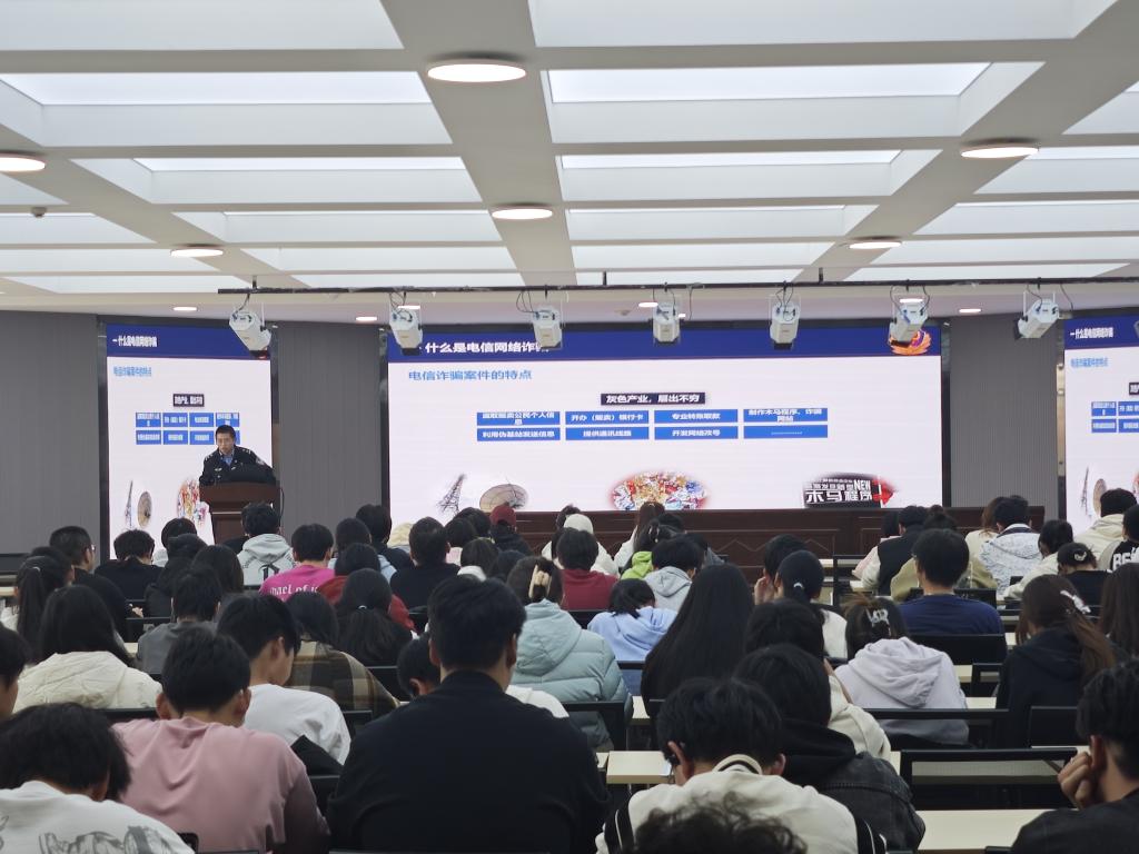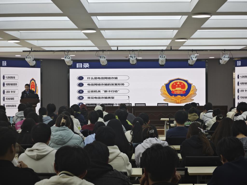 贾警官通过展示讲解PPT及播放视频,从什么是网络诈骗、电信网络诈骗的发案形势、公安机关“断卡行动”、常见诈骗类型等方面。在讲解防范方法时,更是结合实际,从反诈方法策略到提醒同学们下载国家反诈APP及注册金钟罩,细致入微,切实提高了杏林学子的反诈能力。。