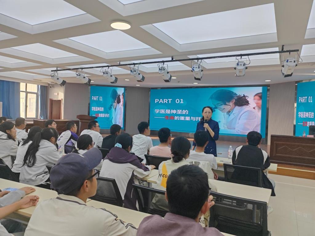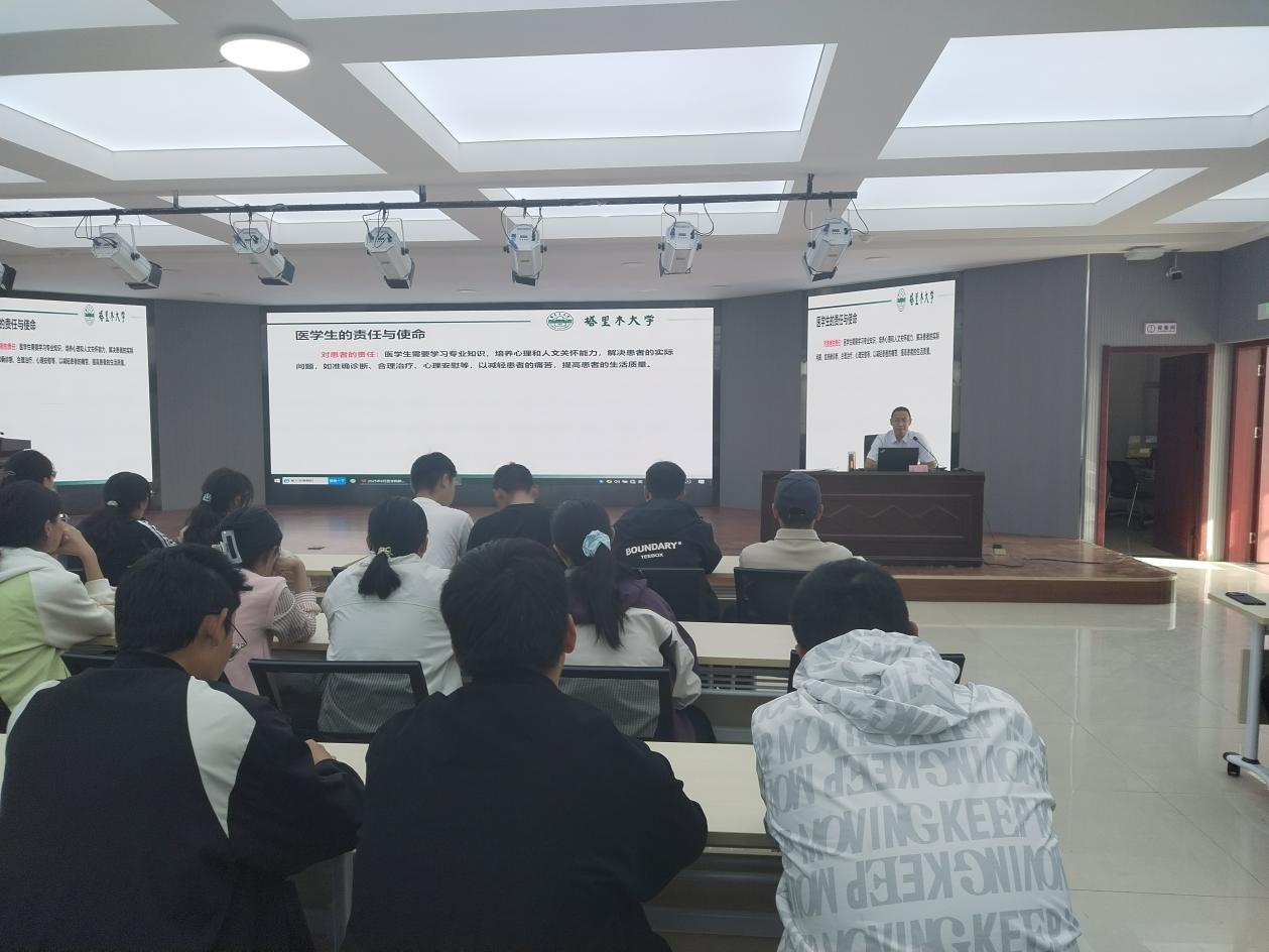 党委书记孟琪以“医起筑梦”为题,结合兵团医疗战线前辈扎根边疆、守护百姓健康的鲜活案例,深入阐释胡杨精神的时代内涵,引导新生将个人理想融入边疆医疗卫生事业发展。