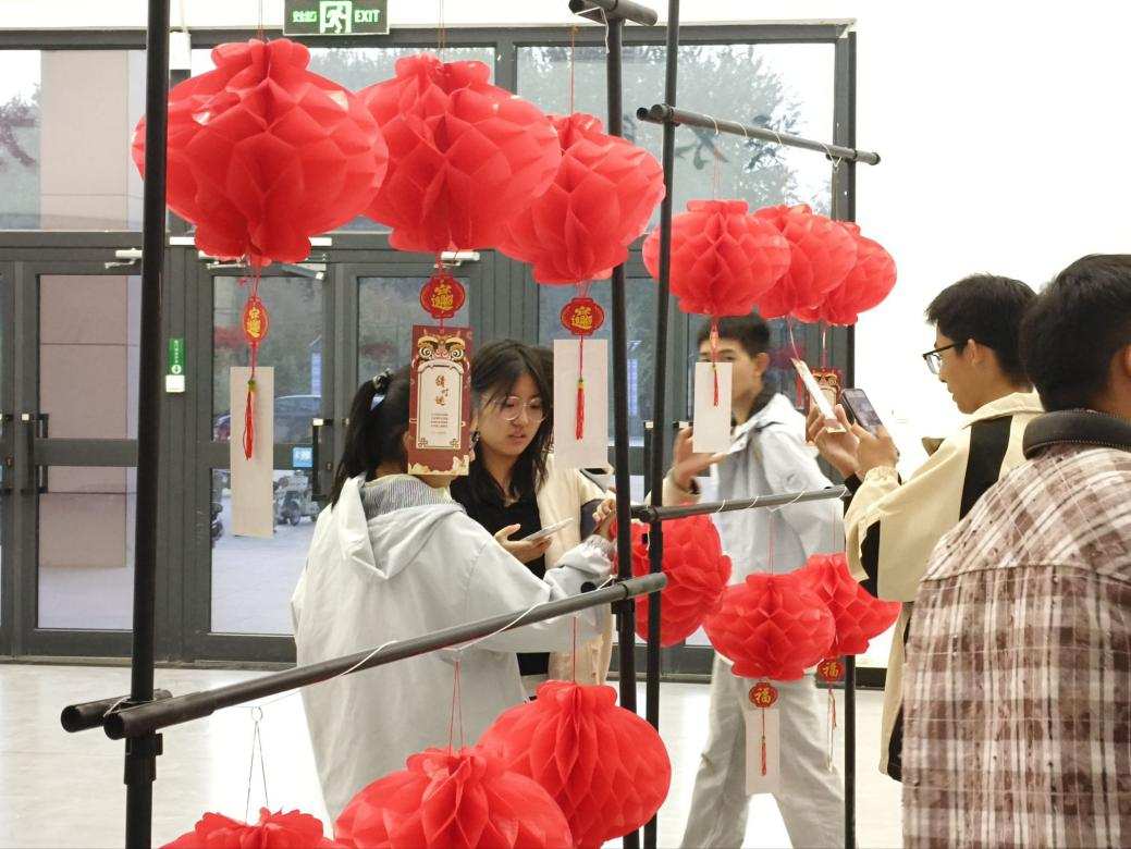 灯谜竞猜活动现场,几十条灯谜悬挂于灯笼之下,谜题既含经典诗句,也巧妙融入医学专业元素。