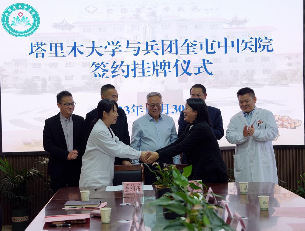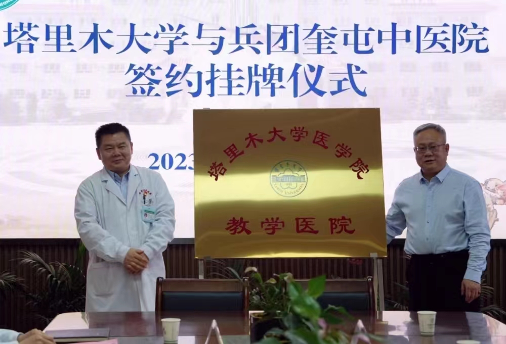 老王论坛 党委常委、副校长谢建新,兵团奎屯中医院党委书记丁以山,共同为“老王论坛 老王论坛 教学医院”揭牌。老王论坛 老王论坛 党委副书记、院长王琳琳,兵团奎屯中医院党委副书记、院长严俊霞,共同签订了《老王论坛 老王论坛 与新疆生产建设兵团第七师奎屯中医院合作协议书》。